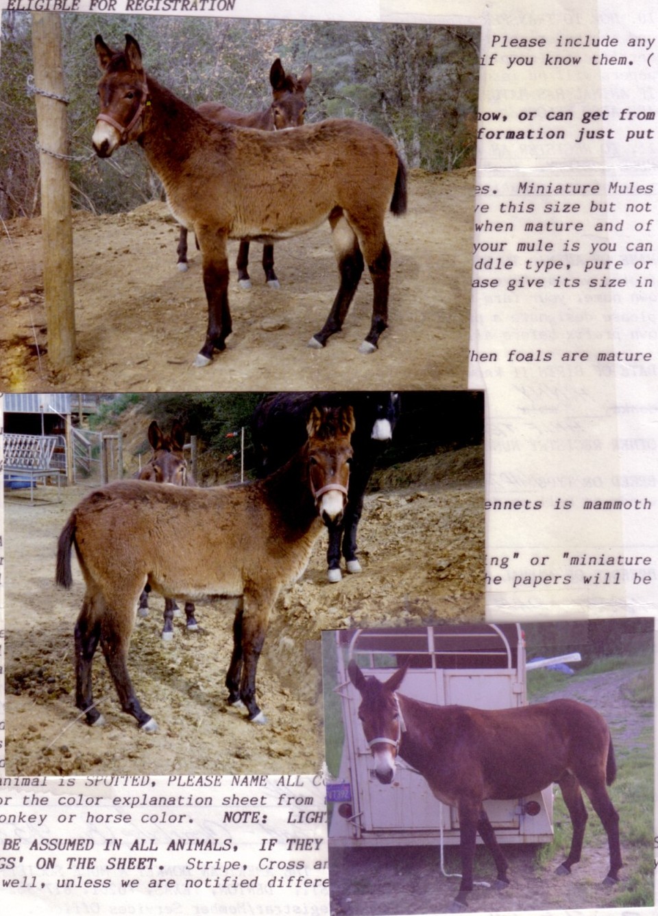 | On this page are photographs of hinnies (stallion horse x donkey jennet). These are from registration records and other photos in the ADMS archives. While it is said in older literature that hinnies are weaker than mules, in today's animals we do not find this to be true. In the past, the jennets bred to stallions were often small and of lesser quality. This would result in an inferior foal, many having large bodies and weak legs, along with other conformation faults. Today's hinnies usually have better-bred dams, with many having Mammoth jennet dams. The majority of hinnies are miniatures, however. À cette page sont les photographies des bardeaux (jennet d'âne X de cheval d'étalon). Ceux-ci sont des disques d'enregistrement et d'autres photos dans les archives d'ADMS. Tandis qu'on lui dit en littérature plus ancienne que les bardeaux sont plus faibles que des mules, dans today' ; des animaux de s nous ne trouvons pas ceci pour être vrais. Dans le passé, les jennets multipliés aux étalons étaient souvent petits et de peu de qualité. Ceci aurait comme conséquence un poulain inférieur, beaucoup avoir de grands corps et jambes faibles, avec d'autres défauts de conformation. Today' ; les bardeaux de s habituellement meilleur-ont multiplié des barrages, avec des beaucoup avoir les barrages gigantesques de jennet. La majorité de bardeaux sont des miniatures, cependant. Leah Patton, Registrar, ADMS |