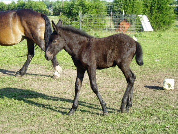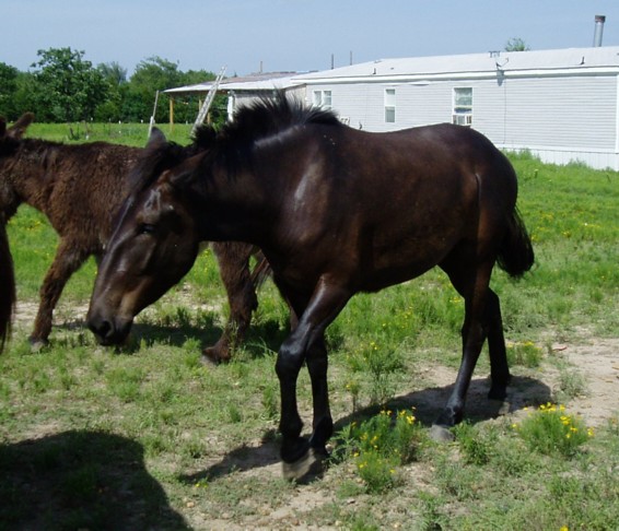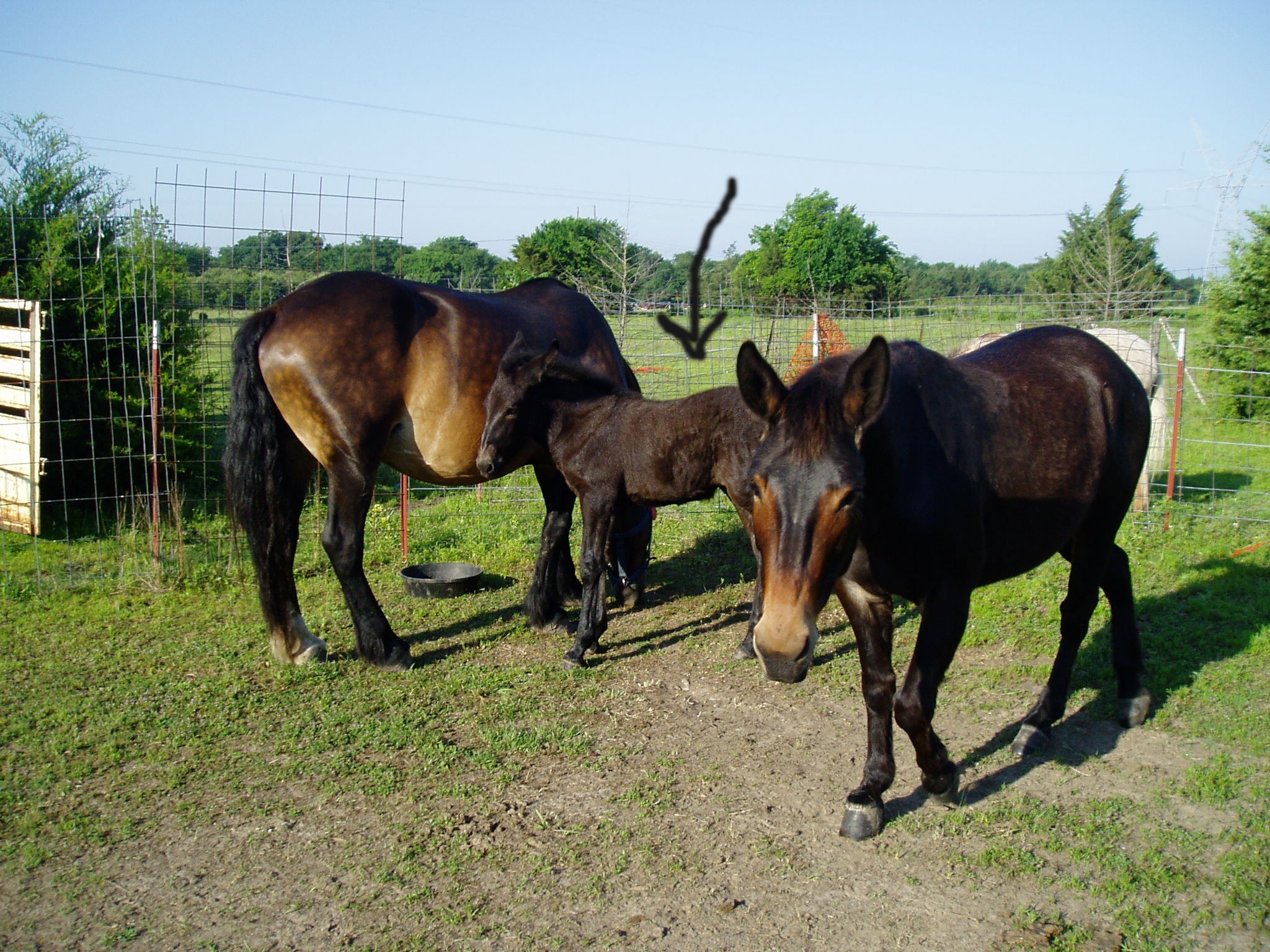 This is an acceptable photo of the mule foal. Though it is a little difficult to see, and the background is cluttered, it is a good side-view of the animal. The color can be clearly seen. Please leave photos like this and do not try and cut out around the animal. This is a better view with less clutter. The animal is again the correct size in the fram. Walking photos are accepted, though of course good halter-posed/standing ones are better. MAKE SURE ALL OF THE ANIMAL is included in the photo - this includes body, legs, head, tail and ears. ADMS receives countless photos with parts of the animal missing - most often feet head and ears. This is not an acceptable photo, as the animal being registered (arrow) is blocked by another mule. This photo would only be useful to ADMS if it were needed for color comparison. |